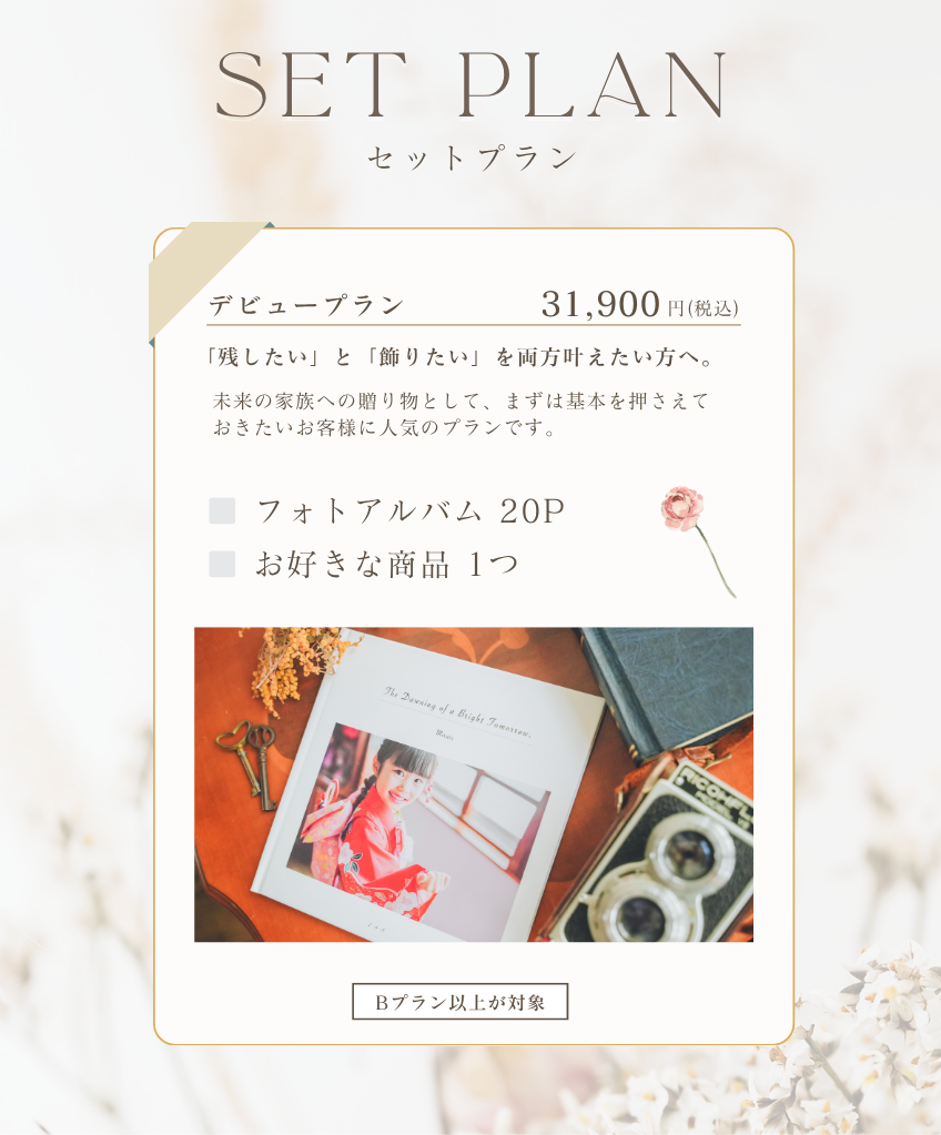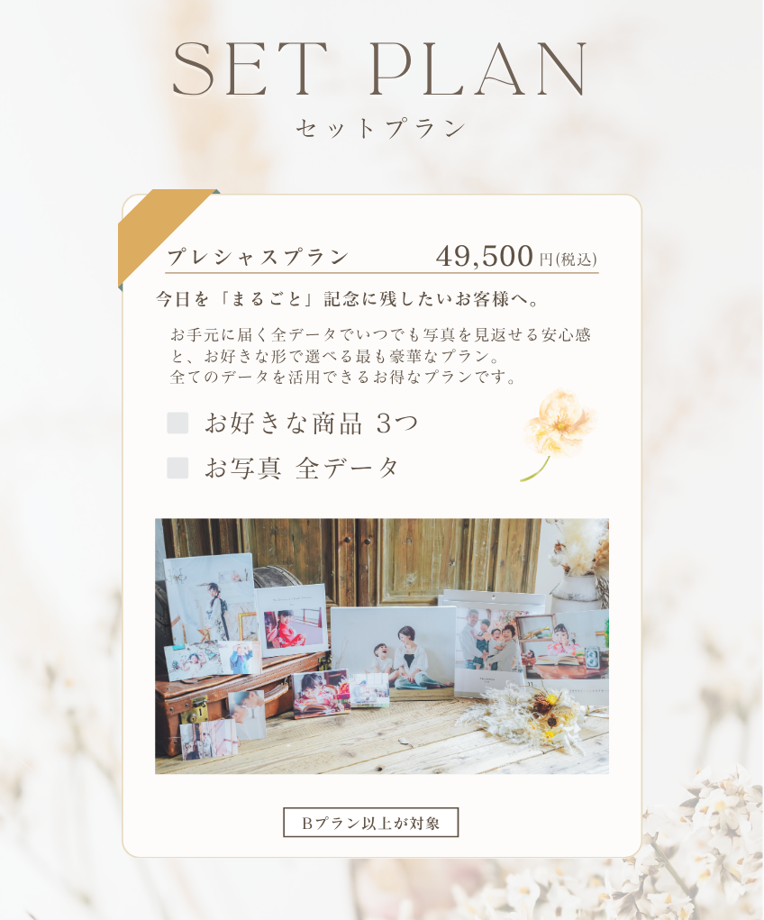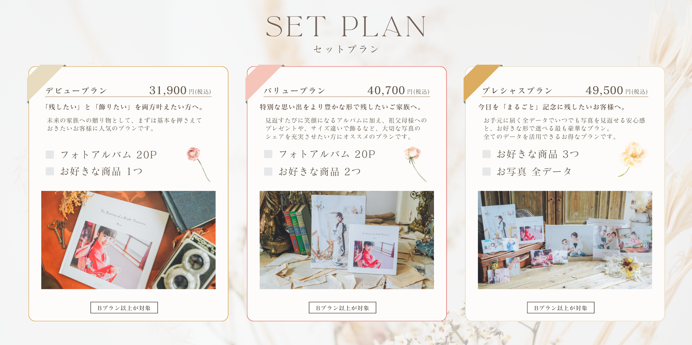 Cプラン | ¥70,400 | データ70枚 | ・プレミアム衣装込 ・アルバム等商品込 ・衣装追加1着 |