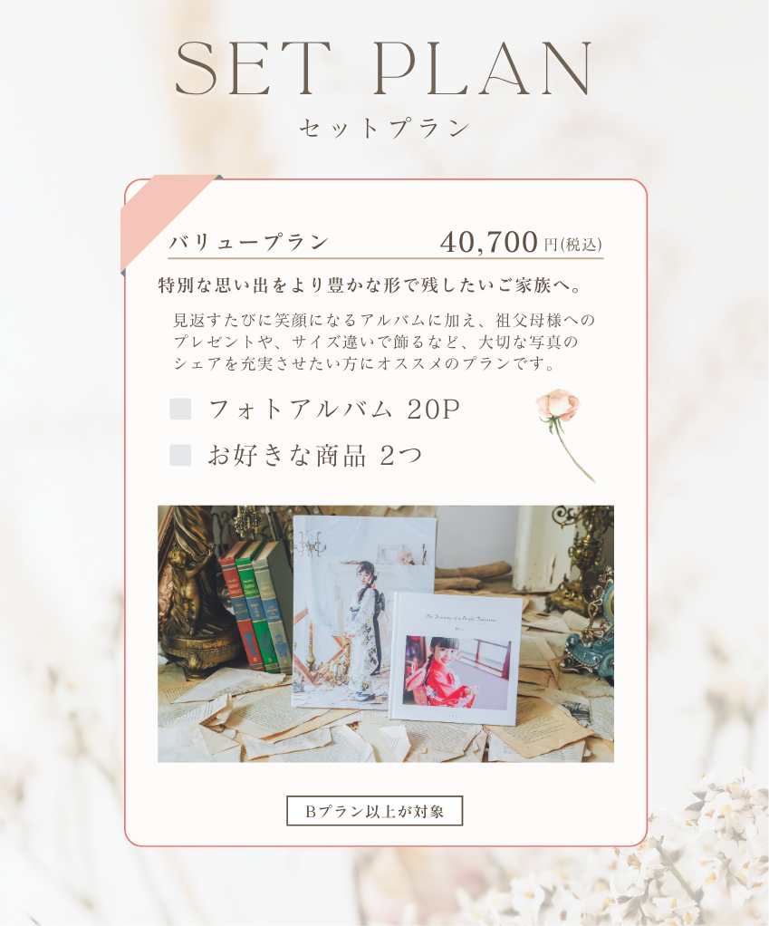 通常Aプラン(5歳) + 3歳のメイン追加(3歳ソロの写真撮影が可能に) + 七五三追加 3歳 + 通常ヘアメイク
